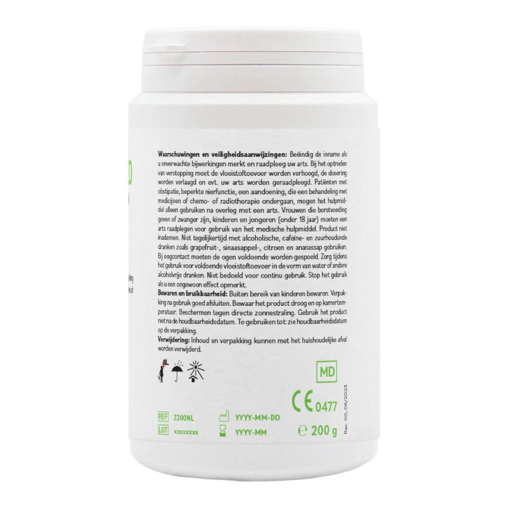 Medisch hulpmiddel! voor oraal gebruik: 2-3 maal daags 1 afgestreken theelepel (= 2 g) in een glas water (250 ml) roeren en voor de maaltijd opdrinken. De innameduur bedraagt maximaal 12 weken. Bij herhaaldelijke inname moet een gebruikspauze van minimaal één week in acht worden genomen.